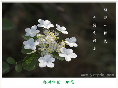 瓊花為揚(yáng)州市花,自古以來有“維揚(yáng)一株花,四海無同類”的美譽(yù)。瓊花是我國特有的名花,文獻(xiàn)記載唐朝就有栽培,瓊花的壽命較長,揚(yáng)州大明寺內(nèi)一株清朝康熙年間種植的瓊花,已有300多年的歷史,如今依然繁茂,風(fēng)姿如故,風(fēng)韻仍不減當(dāng)年。它以淡雅的風(fēng)姿和獨(dú)特的風(fēng)韻,以及種種富有傳奇浪漫色彩的傳說和逸聞逸事,博得了世人的厚愛和文人墨客的不絕贊賞,被稱為“稀世的奇花異卉”和“中國獨(dú)特的仙花”。